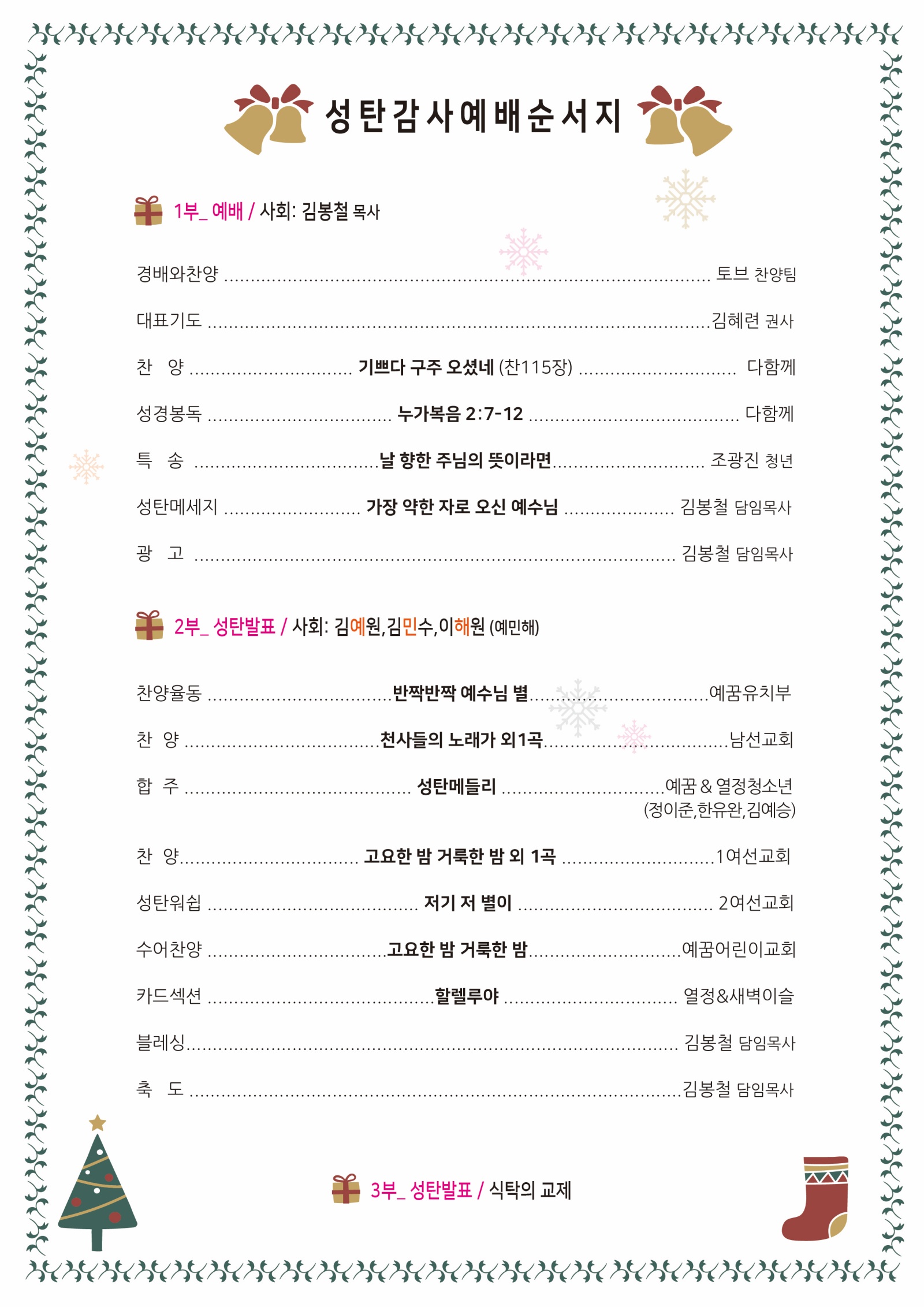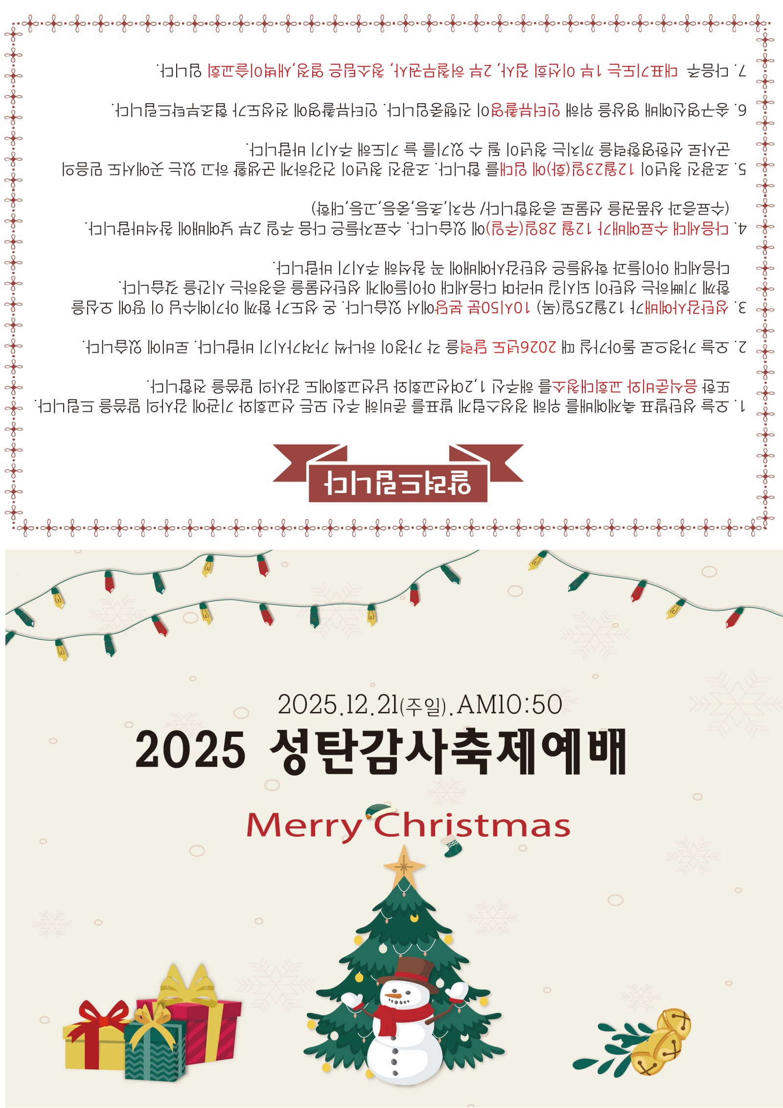 | 이전글 | 2025.12.28주일주보(송년주일) | 김봉철 | 2025.12.28 | 0 | 261 |